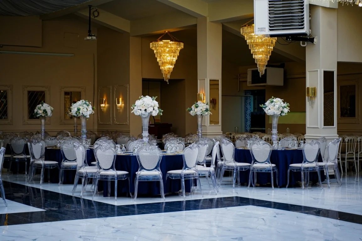 Oldukça zarif bir tarza sahip salonumuzun dekorasyonunda açık renkleri kullanıyoruz. Beyaz renkteki masa ve sandalyeleri pudra rengi masa örtüsü ve sandalye detaylarıyla süslüyor, supla ve vazolarda altın rengi tercih ediyoruz. Bu sayede hem şık hem de sade bir görünüme kavuşuyoruz. Eğer davetinizde özel bir konsept hayata geçirmek isterseniz, zevkinize uygun renklerde süslemeler ve dekorları bir araya getirme şansımız da bulunuyor.