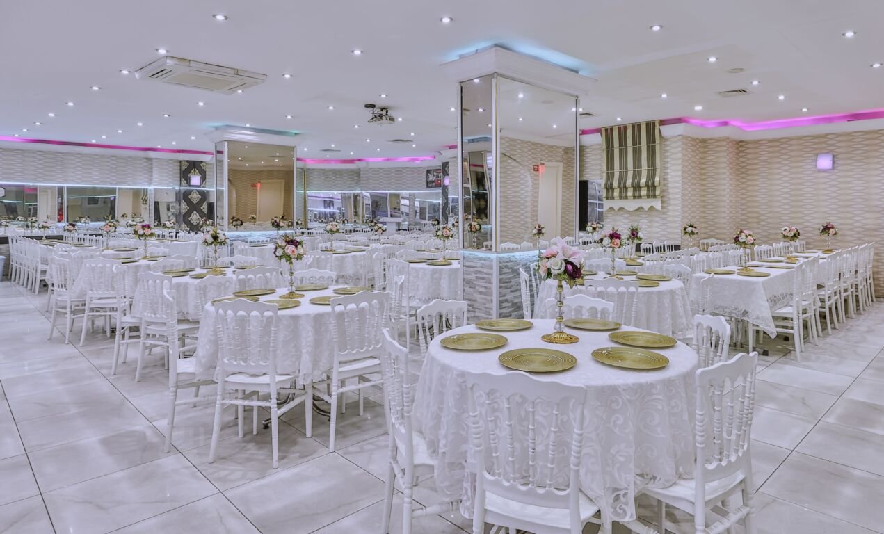 Aynalı kolonların ferah bir görünüm verdiği mekanımızda aydınlık ve modern bir izlenim için beyazı ağırlıkta kullanıyoruz. Masa örtüleri ve tiffany sandalyeler beyazken suplalarımız ve masaları süsleyen kristal şamdanlarımız altın rengi. Pembe ve siyah tüllerle sandalye dekorasyonu yapılıyor. Beyaz nikah masasını ve sandalyelerini aynı renkte tüllerle süslüyor, zarif bir dokunuş için çiçekler tercih ediyoruz.
