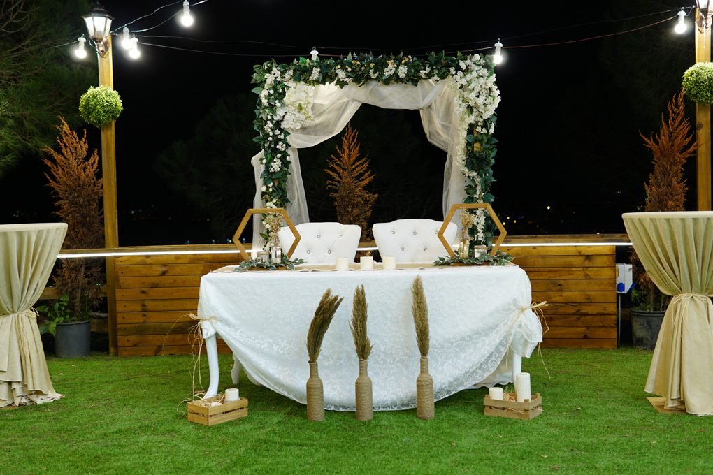 Bahçemizde bulunan yuvarlak masalar ve tiffany sandalyeler oturma düzenini oluşturuyor. Beyaz örtüler, beyaz tüller, cam kadehler ve hasır suplaların mevcut olduğu masa düzenimiz sizin özel bir konsept isteğiniz olması durumunda konseptinizle uyumlu aksesuar ve renklerle dekore ediliyor. Yemyeşil heybetli ağaçların arasına yerleştirdiğimiz renkli ampuller ortamın doğallığına uyum sağlarken zarif bir görüntüyü de beraberinde getiriyor.