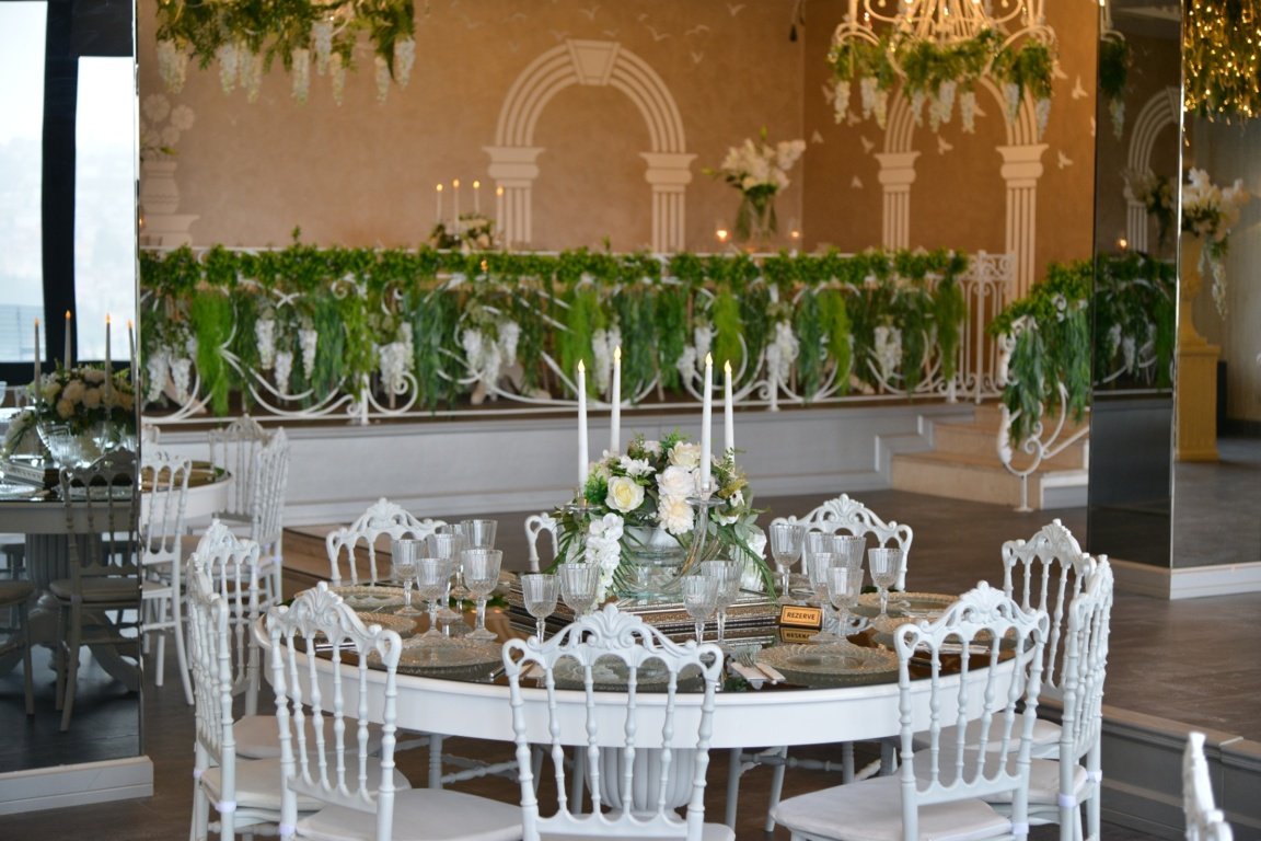 Dekorasyon açısından, beyaz aynalı masalar ve beyaz renkteki napolyon model sandalyelerle şık bir atmosfer yaratılmıştır. Beyaz çiçekler eşliğinde beyaz rengin asaletinden faydalanarak güzide bir uyum yakalıyorlar. Dilerseniz davetinizin öncesinde örnek masa hazırlıyorlar, böylece dekorasyon konusunda da zevkinize uygun olacak şekilde bazı değişiklikler talep ediyorsunuz.