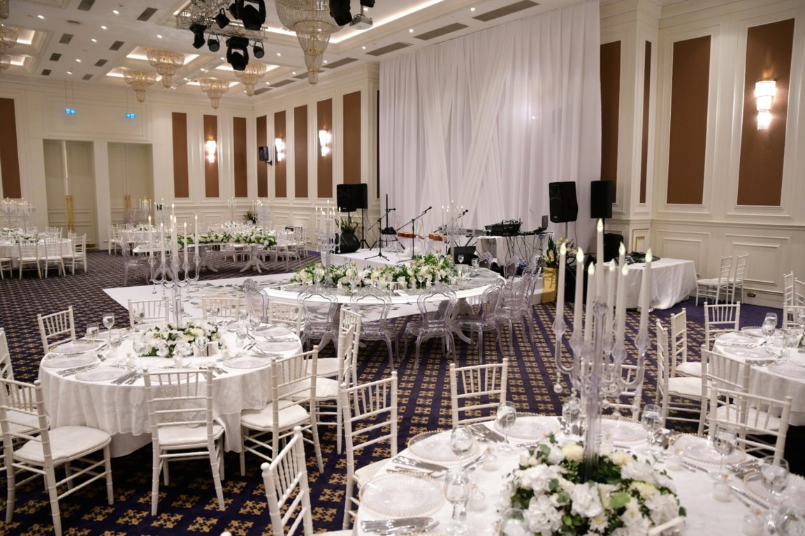 Ferah bir ortamda eğlenmenize imkân sağlamak için salonumuzu beyaz ağırlıklı klasik bir balo salonu şeklinde dizayn ettik. Tavanda kullandığımız kristal avizelerle ışıl ışıl bir atmosfer yarattık. Düğünlerde çiftlerimizin zevkine göre farklı konseptlere yer veriyoruz. Dekorasyonda bazen siyah rengin ihtişamından, bazen beyaz rengin kibar görüntüsünden yararlanıyoruz. Mekanı, çiçekli arka plan tagı, gösterişli vazolar, kristal şamdanlar ile süslüyor, konseptinize uygun hale getiriyoruz.